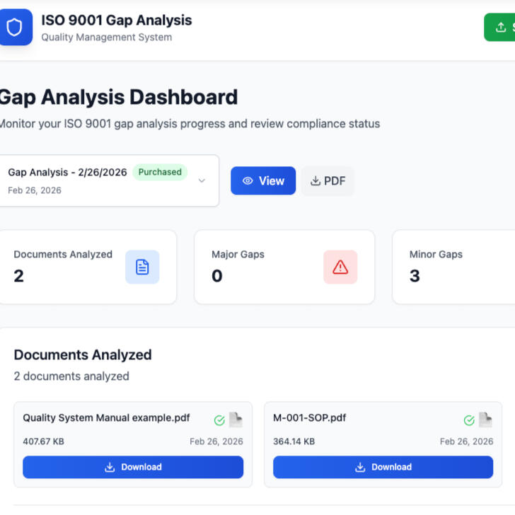 Built specifically for ISO 9001:2015 compliance analysis. Every requirement mapped and validated.